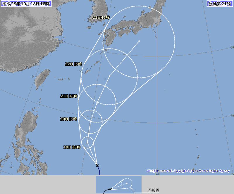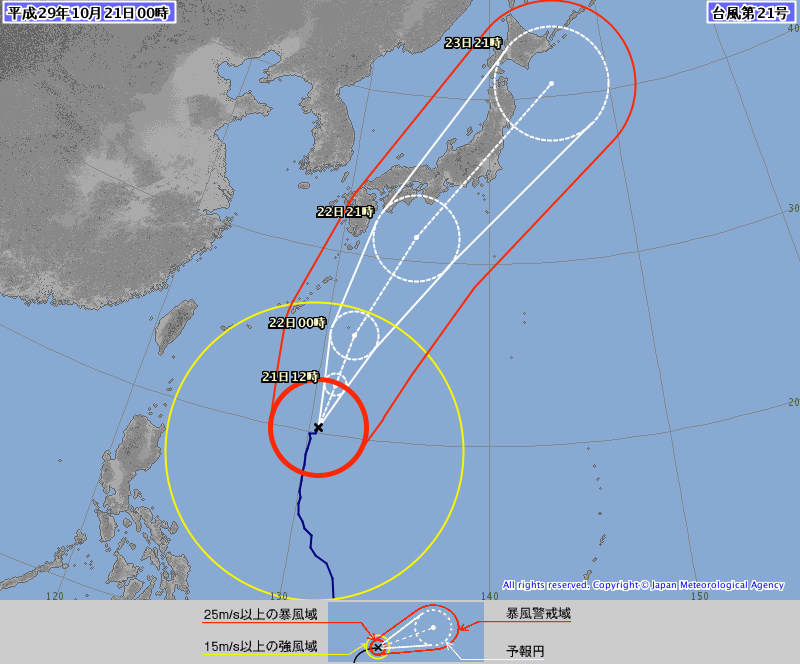 [3]台風21号は進路がほとんど海上であるため、陸上で勢力を削がれることが期待できません。中心付近の気圧が950hPaという強い勢力を保った状態で、足摺岬から房総半島にかけての地域で本州または四国に上陸することが予想されます。中心気圧が低いと、海面が台風に向かって吸い上げられるため、潮位が高くなり、沿岸部では高潮のリスクが高まります。特に、都市近郊部の海抜が低い、または0メートル以下になるような地域ではリスクが非常に高くなります。23日の朝の満潮が7時過ぎになる見込みのため、上陸地点が東寄り(名古屋~房総半島)になった場合はタイミングが重なり、さらにリスクが高まります。リスクの高い地域では浸水に備えて下さい。ハザードマップを確認して安全な避難経路を確認しておくこと、早目の避難を心がけることを強くおすすめします。念のため貴重品や、水に弱い生活・情報家電などを家の2階に一時的に避難させることも考慮された方がいいかもしれません。